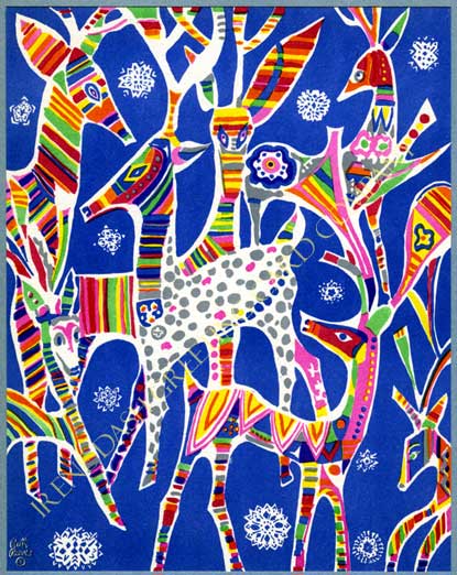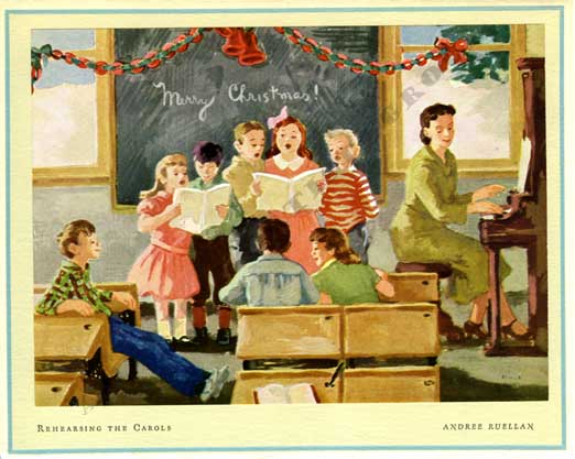 The new company focused on a few individual artists. Ruth Reeves designed the cards for the inaugural season. In quick succession, Tasha Tudor and Eyvind Earle followed, enhancing the line with their wonderful designs. Each artist’s cards appeared in a separate book which was placed in fine department stores and card stores. The customer could browse through the various designs by each artist, select a greeting and personalize the card for businesses or for the many friends and family on holiday card lists.